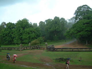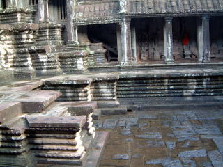 お昼食べたりお土産買ったりした後、次はいよいよアンコールワットです!表門は混んでるということもあり、裏門(東参道)から入ります。ホントにぜんぜん人いない…したら突如スコールが! 予めガイドさんに傘持っててねーと言われてたので持っては来てたけど、すごい晴れてるし雨なんて降るのかな?と思ってた…降って来たなーと思ったら間もなく猛烈な豪雨になって、ふくらはぎまではねるぐらいの。からがらワットへ逃げ込むも、けっこう天井穴開いてて雨漏りがッ(汗)