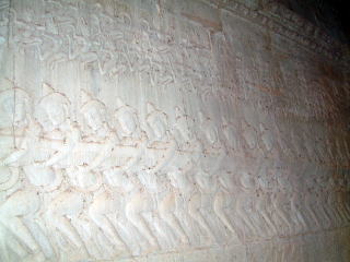 まず外側(第一回廊)の壁面彫刻を見ます。右は乳海攪拌(ヒンズー教の創世話というか)の綱引きのようす。