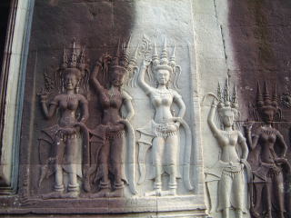 第三回廊の外周りが第二回廊になるので、5つの塔を見上げながら(右上)、壁面彫刻(右下)を見たりします。デヴァダー(天女)は一体ごとに衣装や装飾品が違ってるということで、見ごたえあるね。