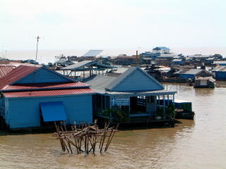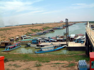 お昼頃ホテルに戻りまして、チェックアウトしてお昼ごはん食べたら、最後の観光地、トンレサップ湖へ。今はまだ雨季も始まったばかりですが、もっと降るようになれば湖じたい大きくなって、東南アジア最大規模とか。上左のボート乗り場から川を下ります。たいがいボロいボートだけど、ライフジャケットがあるのもあって、着けてる人もいたけど、浅いとこひざぐらいまでしか水ないのに?(汗)最も深いとこを選んで行くのですが、それでもちょいちょい引っかかって止まってた…