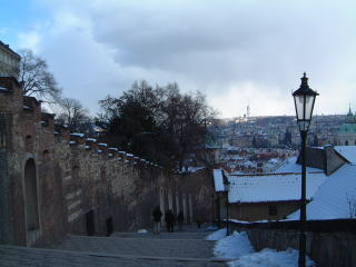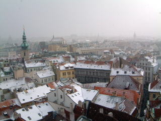 カレル橋を渡りきりますと旧市街で、お土産物屋さんとかみしみし立ち並びます。左は旧市庁舎。毎正時ごとにからくりの動く天文時計があって、時刻近くになると人だかりが出来るんだけど、実はからくり自体はとっても控えめなので… あと旧市庁舎は中に入れて、塔の上からの展望はちょっといいです↓。しかしこん時ちょうど小雪が舞っててうひーってかんじ。しかもここに至るまでの道のりが死ぬほど大変で…エレベータもあるんだけど、せっかくだから地道に登るじゃん。さらにここに入る時、若干の入場料が必要なんだけど、予め見といた金額より安かったんであれっと思ったら、…学生料金にしてくれてた!はう(驚愕)