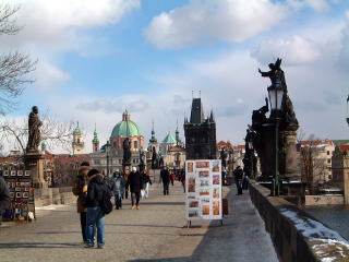 引き続きプラハです。プラハ城を出てこの→風情漂う下り道を駆け下りますと、まもなくカレル橋(右下)。両欄干に聖人像が立ち並び、露天商は自作の絵や人形を鬻ぎ、楽器演奏とか、賑わってるんだけど、やっぱ橋はタダの橋だよなあと思いながら渡り過ぎ。