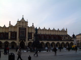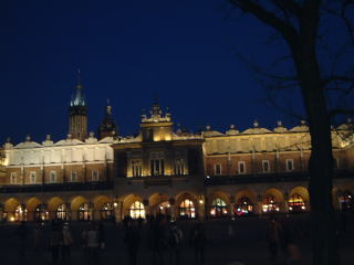 ハイクラクフへ戻ってまいりましたー。旧市街中心部ともなるとさすがに中世そのままの(実際その時以来ずっと残ってる)街並にうっとし。広場の真ん中にあるのが織物会館…といっても今は土産物屋さんがみしりと軒を連ねる。前の銅像はアダム・ミツキエヴィッチ(詩人…だっけ)。右下はこれを裏から見たとこで、夜のライトアップ。きれい。