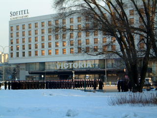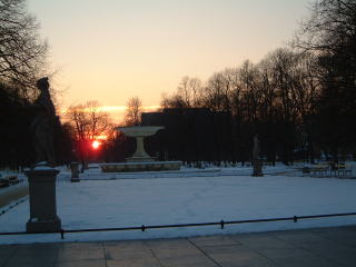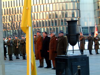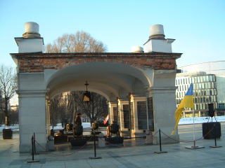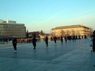 まあだ巡りますワルシャワ観光。ここはサスキ公園。ものごっつ広い広場の奥にある無名戦士の墓→。常に炎が燃えてて、なんか碑とか、戦死者名簿(たぶん)があって衛兵がいて、毎正時ごとに衛兵交代式があるというんだけど、ここへ着いたのが4時ちょい過ぎだったので、あー残念と思ってると、(下左)広場の向こうの方でいっぱい兵隊がなんかやってるよ?100人以上いて楽団とかもいる…。と思ってたら(下右)お墓の前にビシッと整列して、不動のまま…。プラハ城の衛兵交代式で学習したんだけど、こうゆう時は誰か来るのを待ってるのだ!果たしてしばらくするとサイレンが鳴り響き、5〜6台の車がシャーッと入って来て…
