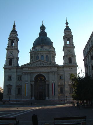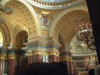 さてくさり橋を再び渡り戻って、聖イシュトヴァーン大聖堂へ。この頃には観光客がけっこういた。下左が外観(手前に広場があるので撮りやすい)、下右が内部。ホントは写真撮っちゃたしかいけなかったけど、しかもミサ中だったけど、欧米人団体客がバシバシ撮ってるので軽く混じって…(笑)こんなキンキラだから。またろうそく灯したり。(お灯明てことかねー)