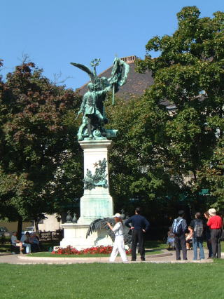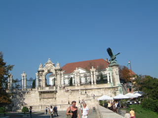ようやく外の世界に戻ったら(左は迷宮出口)、なんか丘のすっごいはずれの方に出てしまって、駐車場とかあって閑散と…王宮の方へ戻ります。したらそっちの方から楽団の音が…走って見に行ったけど、そんな慌てなくてもけっこうしばらくやってた。この下の建物の前あたりでやってて…階段を降りると王宮なのです…右側の鷲(だよね)の像が、丘の下からよく見えてかっこいい。
