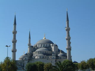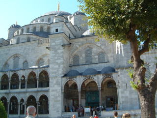 アヤソフィアから道1本挟んでお向かい、スルタンアフメット公園の中にそびえ立って誰でも→このように絵ハガキのような写真が撮れるブルーモスク。しかも天気良くて雲ひとつねー暑いーペットの水を水入りバケツに入れて冷やして(といっても氷は入ってないからぬるいだろーな)「ウォーターワンドルー」とか言って売ってる子供とかいっぱい。しかし同じ水がすぐそこらへんの店で買えば30%くらいの値段だし。アヤソフィアは土足可でしたがここはいったん靴脱いで裸足で入ります。中はやっぱりきれい。