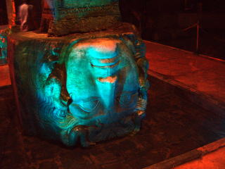 お次はそのナナメ向かいの地下宮殿へ。入り口がわかりにくかった…写真撮ったけど照明のオレンジがぜんぜん出てなくて…パンフの方が見たかんじと近いのでこっちを←。地下宮殿といいましても実際は貯水池。魚も泳いでる。柱が宮殿のようなのでそんな名前になったんだって。板張りの通路を落ちてくる水滴を避けながら(カメラ〜)進み、案外広い最奥にはメデューサの首↓(の彫刻)が2つあって様々に色の変わるライティング。団体客がちょうど来て、ガイドが「さあここにはメデューサがいますよ〜」みんな「ええ〜」とかプチおもしれ…入り口近くには小さめの舞台みたいのがあって、それを見ながらちょっとしたディナーショー(というか飲み物くらいか)も出来るようになってた。