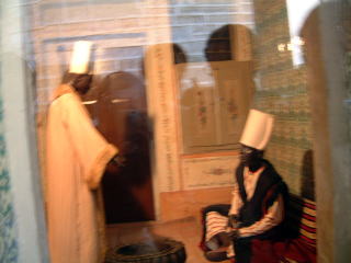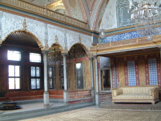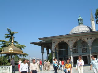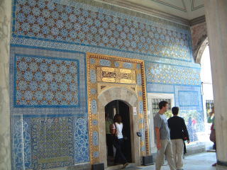 ハレムを出ますと東屋(あずまや)のある広場へ出ます。この左の全部金。噴水のある池とか、図書館(といっても本はなく、さっきのハレムの部屋のような低いソファが並ぶだけのところ)とかいろんな部屋の建物がぽこぽこと。あと庭園。聖遺物の間とゆのがあって、ここでは小部屋に入ってずっとコーラン読んでる(音読)人がいる。扇風機回しまくりで、コップの水あるけどこれくらいじゃもたんだろと余計な心配を(笑)展示物はムハンマドの手紙とか、えっ創始者の?と思ったけどそうじゃなくて同名の、もっと時代の下った人のらしい(たしか)。最後に宝物館(いくつもありすぎ)観る…前に日本に来てたのを観た記憶のある、すんごい大きいエメラルドの短剣があった。キホンエメラルドとルビーだね…あと黄金。他にはカフタン(トルコ式の外套のような服)の間とか、お風呂と床屋の間とか、陶磁器の間とか。ただもうここらへん朦朧としてたのであんまよく…(笑)