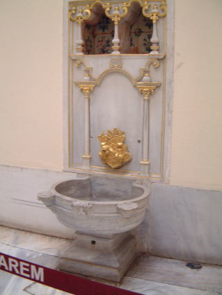 宮殿の入り口入ってすぐ、庭園の右側は宝物庫、左側はハレム。特に順路とかないので先にハレム(ガイドツアーで時間毎にしか入れない)を観ます。英語なんだけど最初あんまわかんなくて、と思ったらあっスルタンってゆってる?(初めて聞く英単語)右上のような人形展示は実はいっこしかなくて、ひたすら上のような豪奢なお部屋が続きます。ここはスルタンの大広間だって…あとスルタンのお母さんの部屋とかも、壁とか天井の模様がとにかくすごくて、シャンデリアとか、あとスルタンのお風呂とか、右は水道ですな。顔洗ったり。生活のようすがびみょうに。