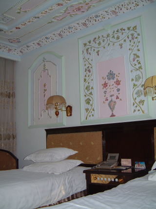カシュガルのホテルでは、ウエルカムダンスなどありつつ(右)、元ロシア領事館だったとこだそうだけど、内装がプリンセス仕様でかわいい!同じ敷地内にあるレストランで昼食ですが、早くも口に合わなくなってまいります…中華をイスラム風にしたかんじで、香辛料がきつく…そんで食べてたら停電(汗) 直んないとゆうのでろうそくが来て、そのまま黙々と食べます…アイドルタイムだからなのかそれともいつもこうなのか、お客様出入り口から思っきし業者がヒツジを下げて入って来たり(大汗)しばらくしてこれを使った(のかな)シシカバブが出る…でもおいしかった。この後何回かシシカバブは食べるんだけど、これが一番。