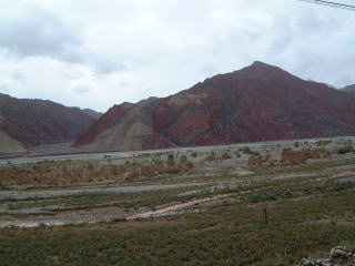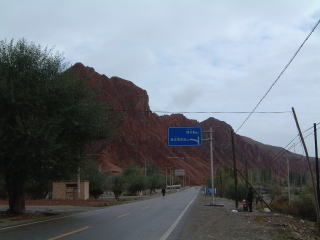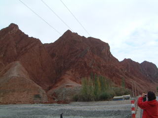 前ページの最後のナン屋はこの道沿いなのです…ちっさいバザールがあって果物とか。帰りには動物も売ってた。で途中レセプションセンター(お土産屋)があって、この近くにあるのが火焔山(左)…てみんな言ってたけど正式名称はオイタグ山。西遊記の火焔山はトルファンにあるんだそうですが、色はこっちのが断然赤いって。鉄分が多いため…他道沿いには黒い山(マンガン)、緑色の山(銅)などあり…