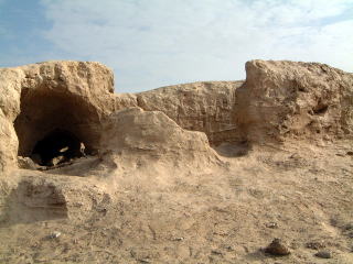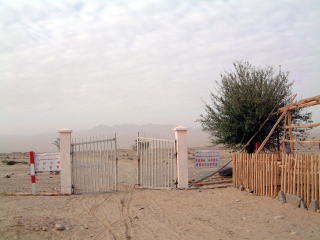 ホータン名物はじゅうたん、シルクそして玉(ぎょく)です!ここでぜったい玉を買わなきゃ!燃える想いを胸に秘め、まずは観光マリクワト古城遺跡。ホータンは昔はウテン(文字が化ける)国といって、その首府跡…だったかな。入り口にはいちおう左上のようなゲートがあって、この右にある管理事務所みたいなとこで入場料(+カメラ料)を払うんだけど、別に人数数えてもいなかったし、どんぶり勘定… そんで遺跡も特に保存の努力とかをしてるわけではないそうで、だから数十年も経ったら風化してなくなっちゃうだろうって。イインデスカ…(汗)