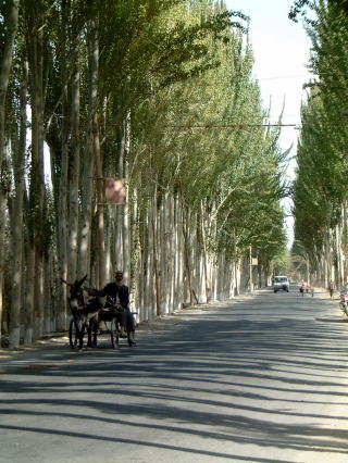 ポプラ並木をゆくロバ車→