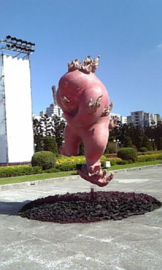 門から紀念堂へのアプローチはふだん一直線だけど、今は何か芸術作品がぽつぽつと展示されてました。うち1つが右端のですが、これは火の精霊か何からしく、下に積んであるの石炭です。この炎天下、近寄るだけでも暑い気が…(汗)